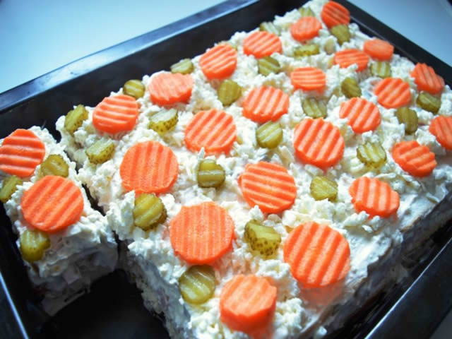 Sastojci: 500g kisele pavlake, 300g majoneza, 300g sunke, 3 jajeta, 4 manja kisela krastavca ili 2-3 veca, 200 + 150g kravljeg sira, so, sargarepa i…