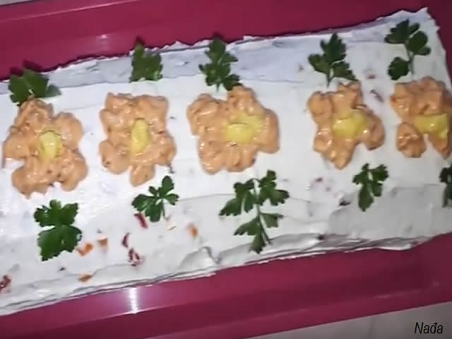 Sastojci za biskvit: 3 veća jaja, 80 g maslaca, 80 g brašna, 400 ml mlijeka, sol. Za nadjev: 250 g kremastog sira (sirni namaz), 150…