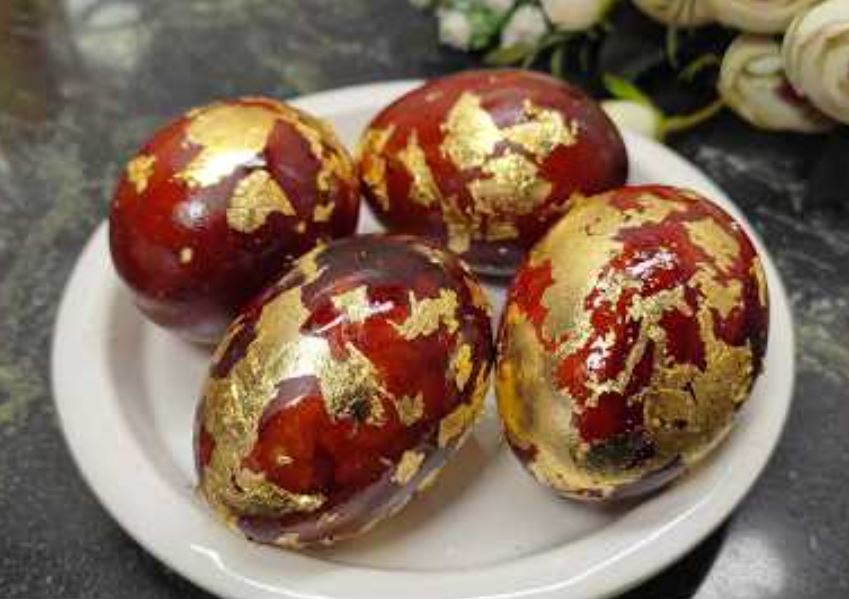 Prirodno, zdravo i elegantno! Sastojci: Jaja (po želji, npr. 6–10 komada) Ljuske crvenog luka (što više, za intenzivniju boju) Voda Sirće (1–2 kašike) Zlato listić…